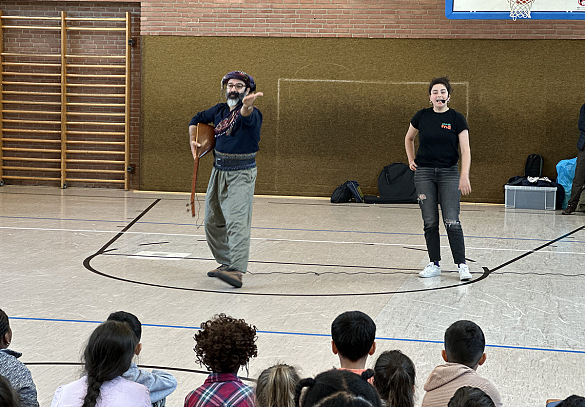 Der Workshop begann mit einer kurzen Einführung in die kurdische Musiktradition. Die Kinder waren begeistert, als die Musiker:innen ihre Bisk, ein traditionelles kurdisches Musikinstrument, vorstellten. Die melodischen Klänge der Bisk erfüllten die Turnhalle und weckten das Interesse der jungen Zuhörer:innen. Doch nicht nur das Musikinstrument stand im Mittelpunkt; die Musiker:innen brachten auch Eimer mit, die als kreative Trommeln dienten. Dies bot den Schüler:innen die Möglichkeit, selbst aktiv zu werden und die Rhythmen direkt zu erleben.